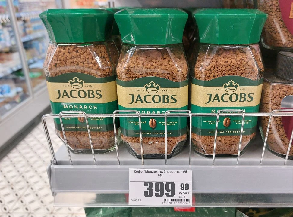 Бренд Jacobs благополучно «ушёл» из России ещё два года назад (переименовался в Monarch), но ничего не мешает заводу в Ленинградской области выпускать кофе под этим брендом для других стран (аналогично работают и другие, например, Nestle). И не мешает продавать его в российских магазинах. Этот кофе под оригинальным брендом выпущен для стран СНГ (Армении, Казахстана, Кыргызстана). Но продаётся и в России, вполне открыто.