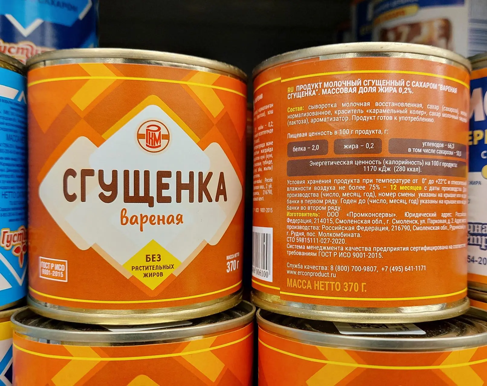 Сгущёнка с сахаром. Без растительных жиров — это действительно так, уже много лет производители делают продукт сгущенный, в котором обходятся без «пальмы». Просто такой продукт получается почти с нулевым содержанием жира, а его основу составляет сухая обезжиренная молочная сыворотка. В данном случае ещё и ГОСТ на лицевой части разместили, хотя сгущёнка произведена по СТО.