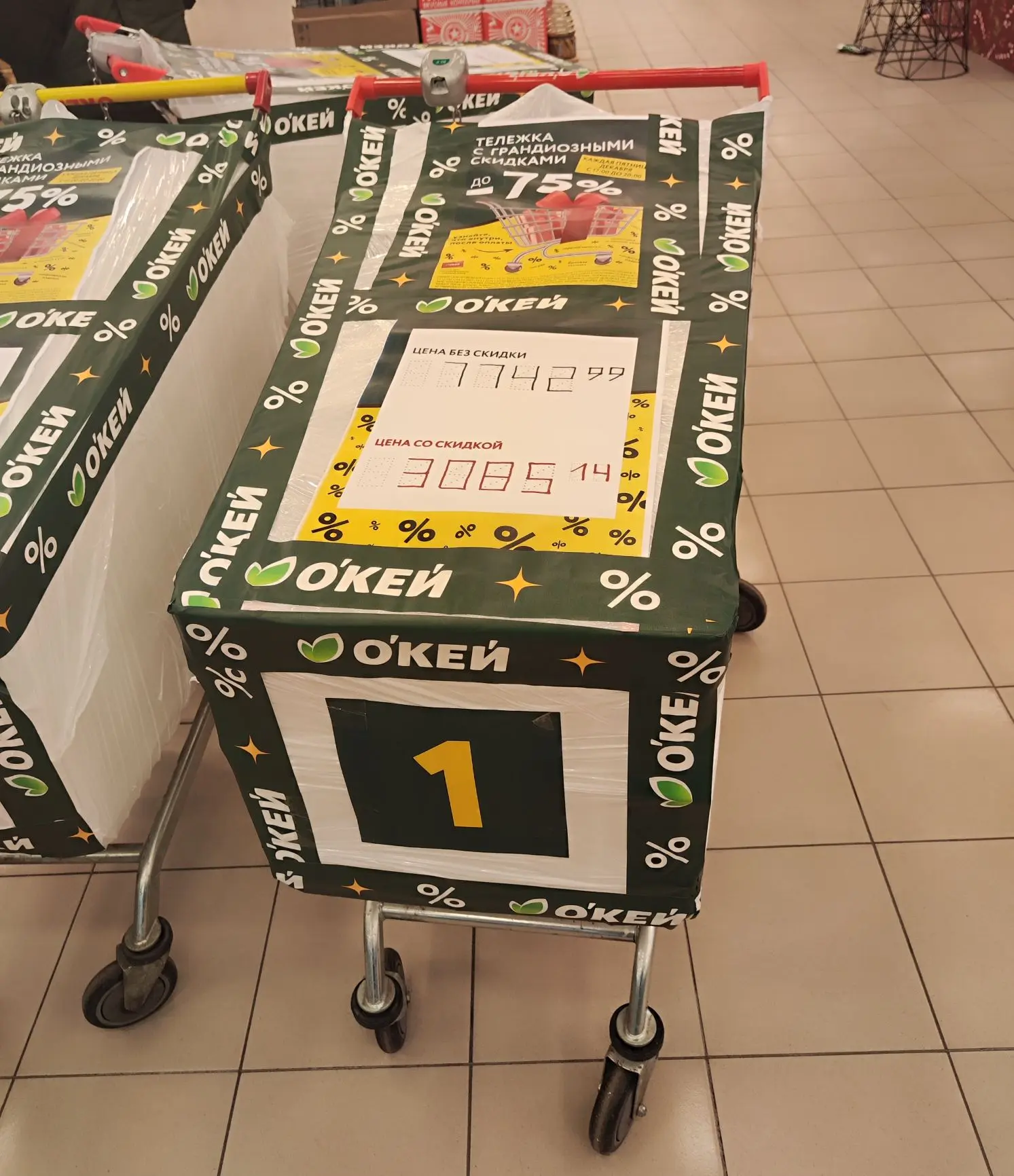 Торговые сети уже не первый год делают промо-акции с тележками, наполненными товарами со скидками. Суть этого аттракциона невиданной щедрости в том, что покупатель не знает, что именно туда положили, пока не оплатит и не вскроет тележку. Но раз акцию продолжают уже несколько лет, значит спрос есть. Насколько нам известно от коллег из сетей, ничего особенного внутри нет — туда кладут товары с акционными ценниками (которые и так по акциям в торговом зале), всякий неликвид (не прямо что-то залежалое, но те товары, продажи которых ниже плановых показателей), СТМ-товары и немного того, что готовят к сливу (т.е., продукцию с вышедшим более чем на 50-70% сроком годности). Спасибо за фото нашей подписчице.
