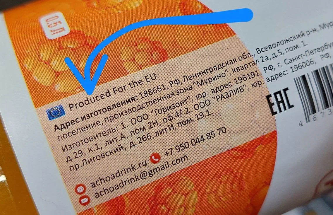 Как же любят некоторые производители замаскировать свою продукцию под «иностранную». Но этот производитель морсов из Мурино пошёл ещё дальше и написал, что его товар «произведён для Европейского союза». Естественно, на английском языке и с флагом ЕС. Хотели найти информацию у них на сайте, но его не существует (хотя адрес указан на этикетке).