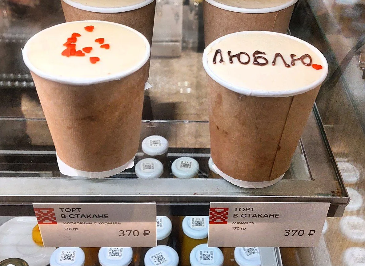 Ещё один вариант продажи тортов — прямо в картонном стаканчике. Каких-то 370 рублей и тортик ваш. Пекарня «Коржов», СПб.