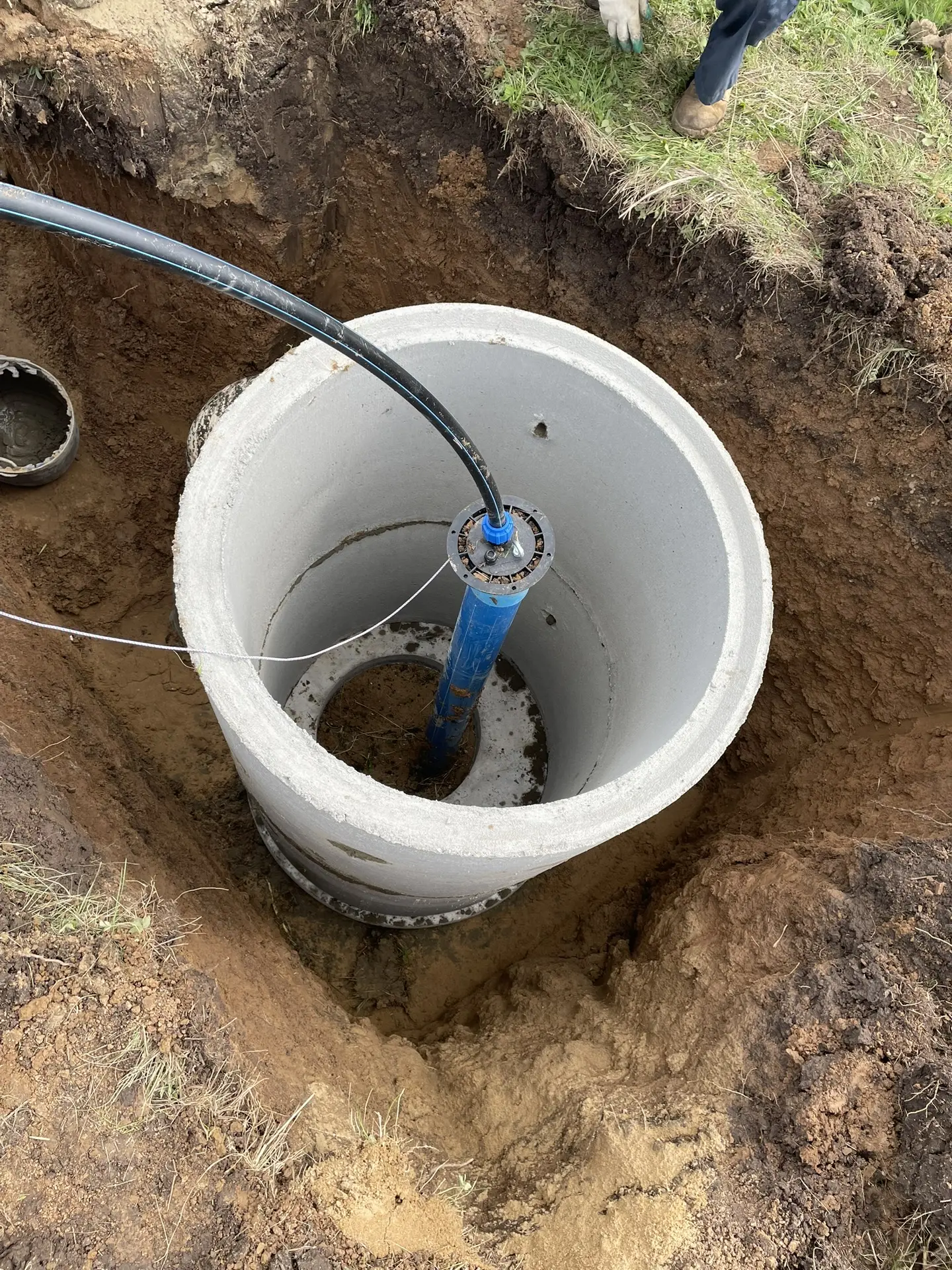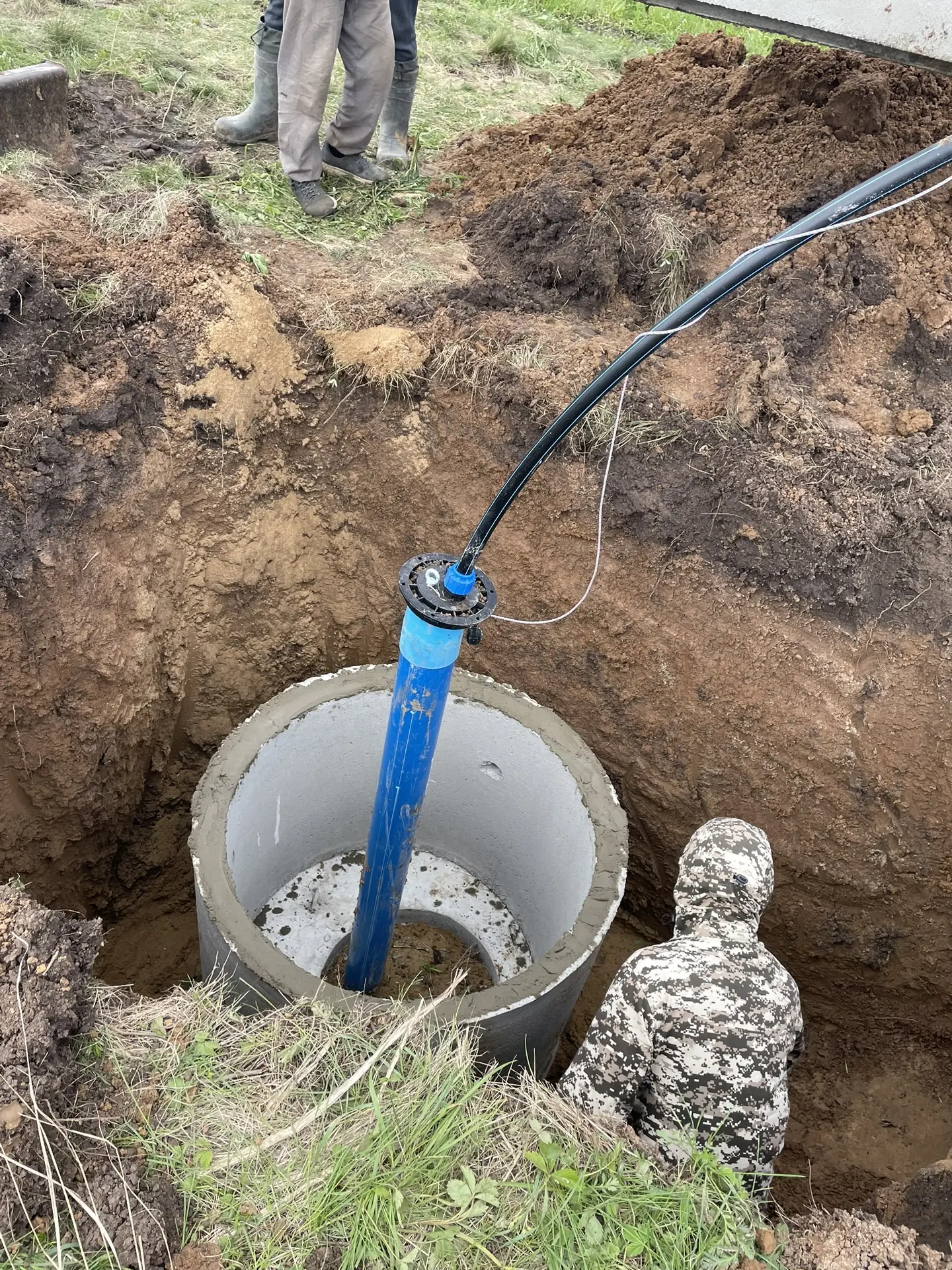 Монтаж кессона из бетонных колец вокруг скважины.