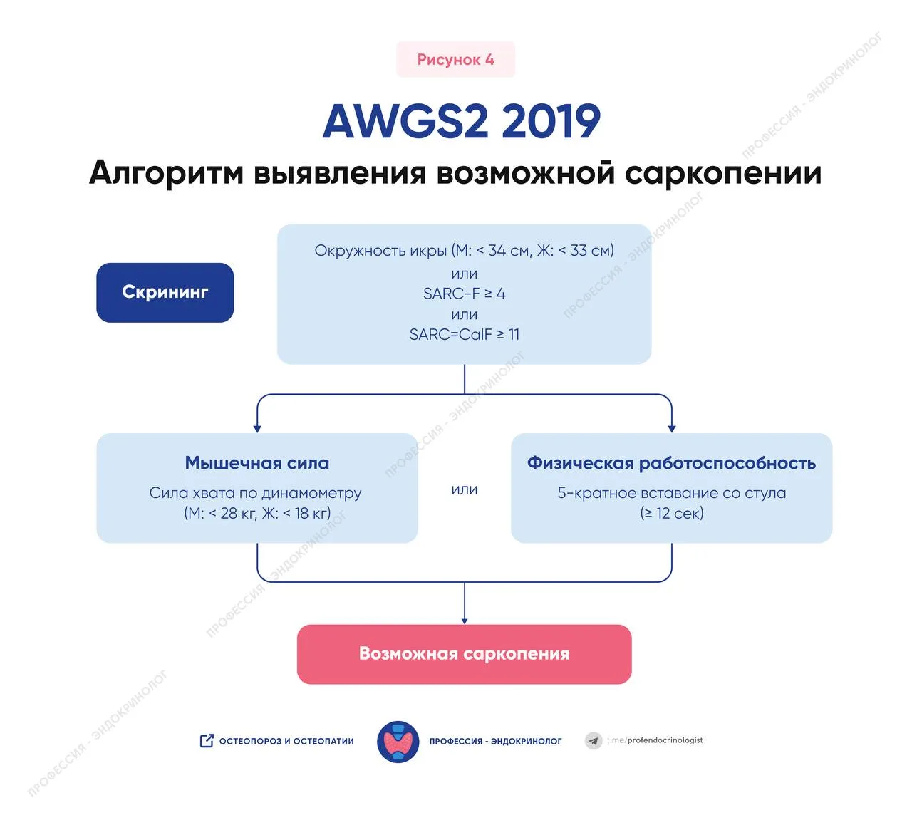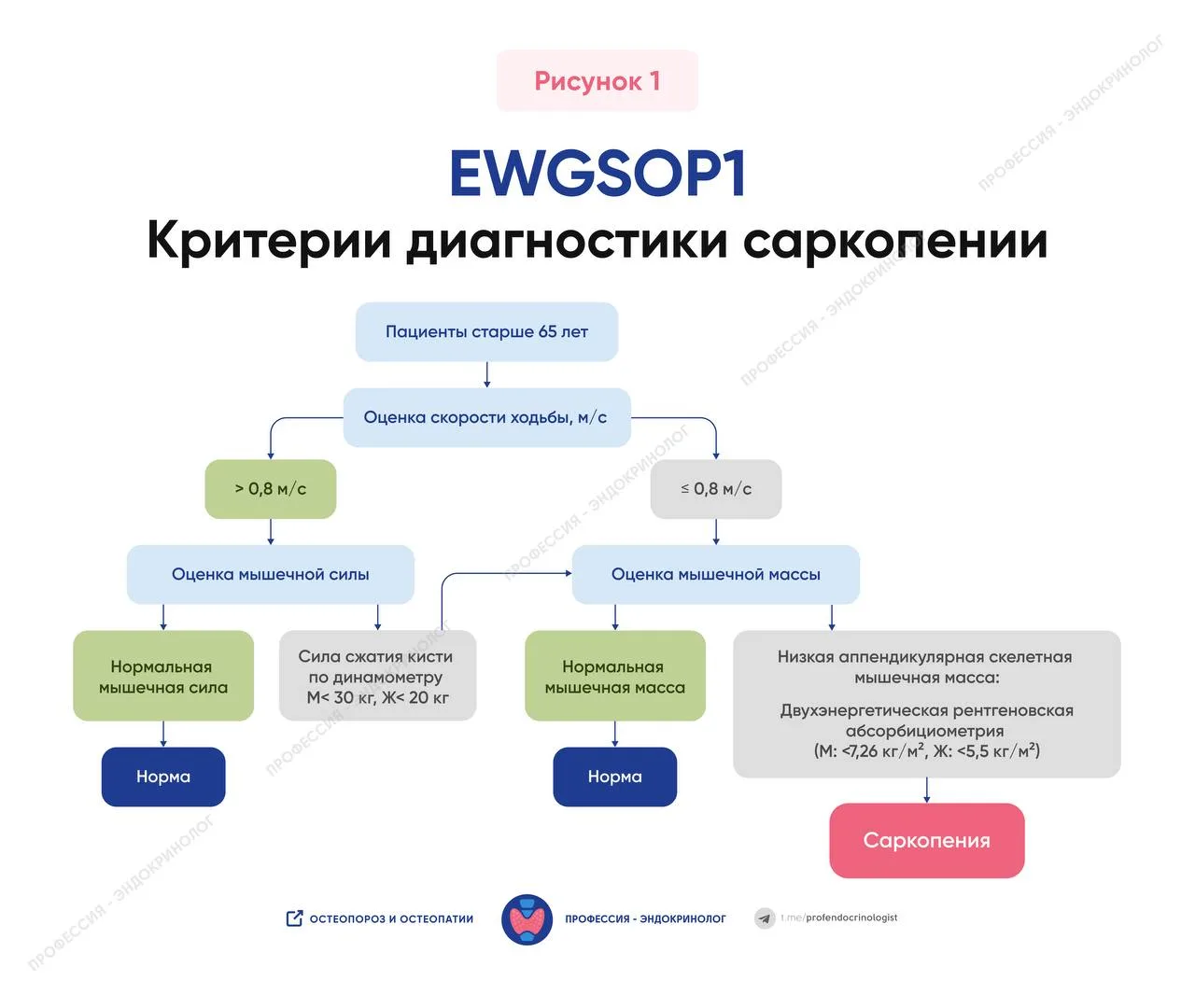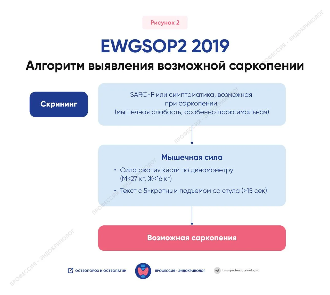 В настоящее время не существует универсального алгоритма диагностики саркопении. Наиболее практичным подходом является поэтапная оценка: