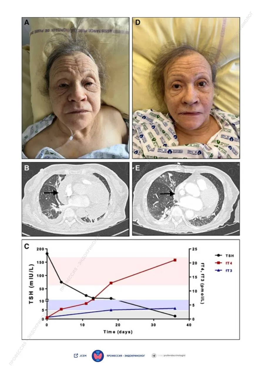 Пациентке была назначена пероральная терапия левотироксином в дозе 75 мкг в сутки. Через месяц после начала лечения, на фоне нормализации функции щитовидной железы (рисунок C), пациентка потеряла 15 кг массы тела, уменьшился отёка лица и объём перикардиального выпота (рисунок D и E).