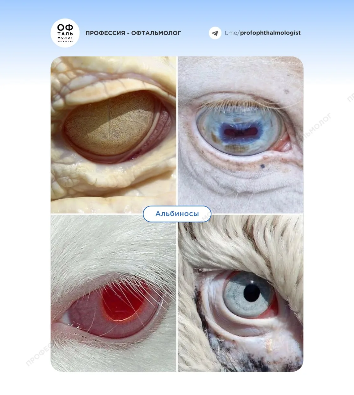 – Альбиносы – отсутствие пигмента делает анатомию «прозрачной», и через радужку видно подлежащие структуры.