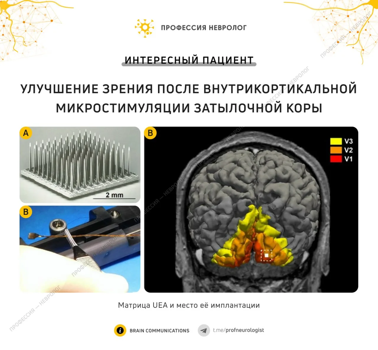Пациенту имплантировали матрицу Utah Electrode Array (UEA) – устройство размером 4×4 мм со 100 электродами. Имплантат разместили на границе первичной зрительной и экстрастриарной коры. Такие системы ранее применяли преимущественно в интерфейсах «мозг–компьютер».