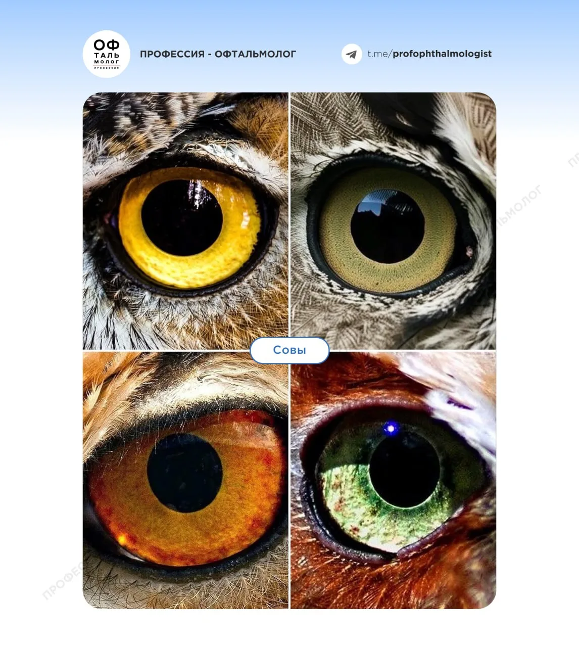 – Совы – огромные округлые зрачки. Их глаза работают как светосильная оптика: собирают максимум фотонов и дают высокую чувствительность ночью.
