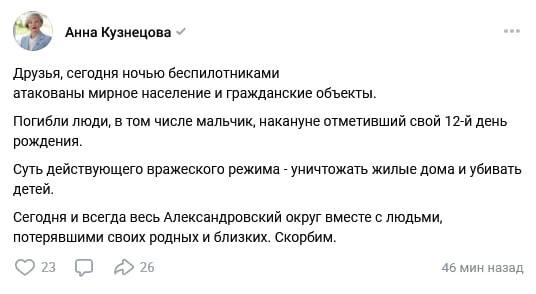 Сегодня ночью в Александровском районе была совершена атака БПЛА. Один из них попал в 2-квартирный жилой дом. Погибли двое взрослых и семилетний сын.