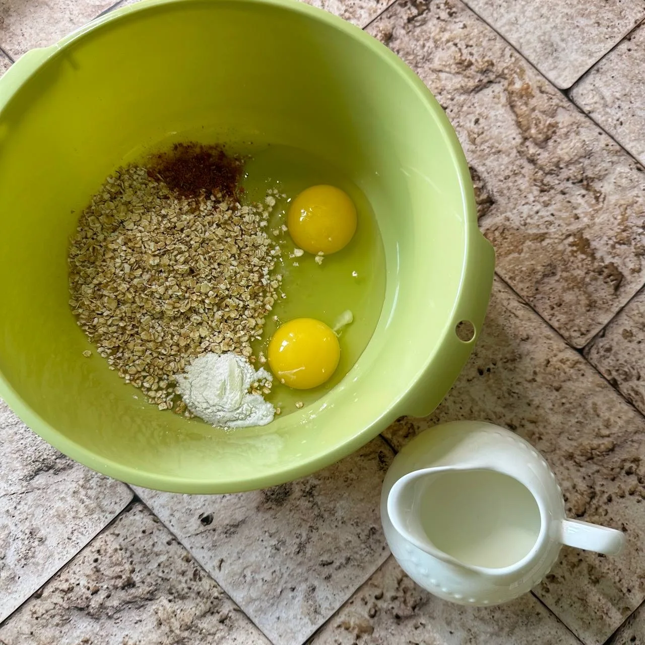 Смешать яйца, молоко, специи. Добавить овсяные хлопья и разрыхлитель. Перемешать и оставить хлопья набухать.
