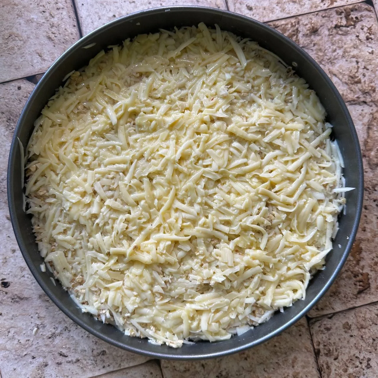 Для верхнего слоя смешать яйцо с натёртым сыром. Выложить сверху на капустную смесь.