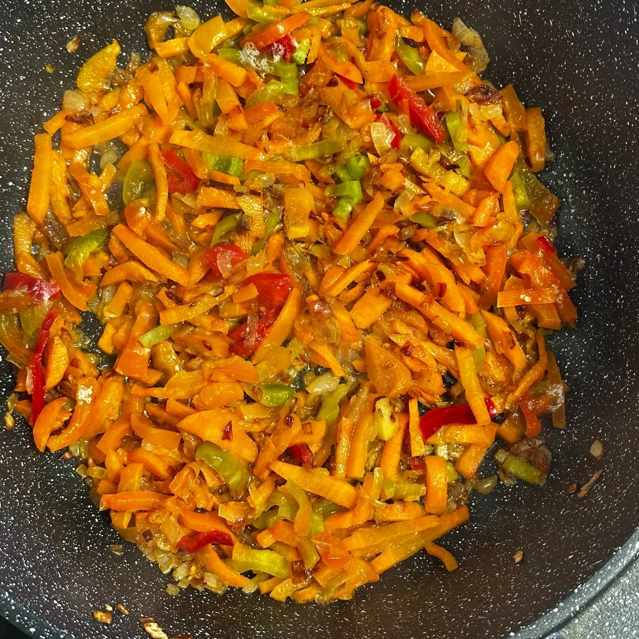лук, морковь, красный болгарский перец. Добавляем томатную пасту, хмели-сунели, копченую паприку.