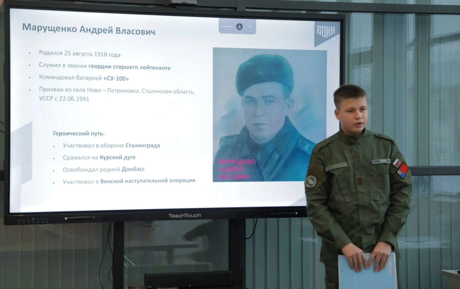В своей работе Егор рассказал историю своего двоюродного прадедушки Марущенко Андрея Власовича, гвардии старшего лейтенанта, командира батареи «СУ-100». В составе полка прошел не одну битву, был несколько раз ранен и получал контузии. По данным карты наступательных операций участвовал в боях за Сталинград и на Курской дуге, освобождал родной Донбасс. Свой последний бой принял в Венской наступательной операции.
