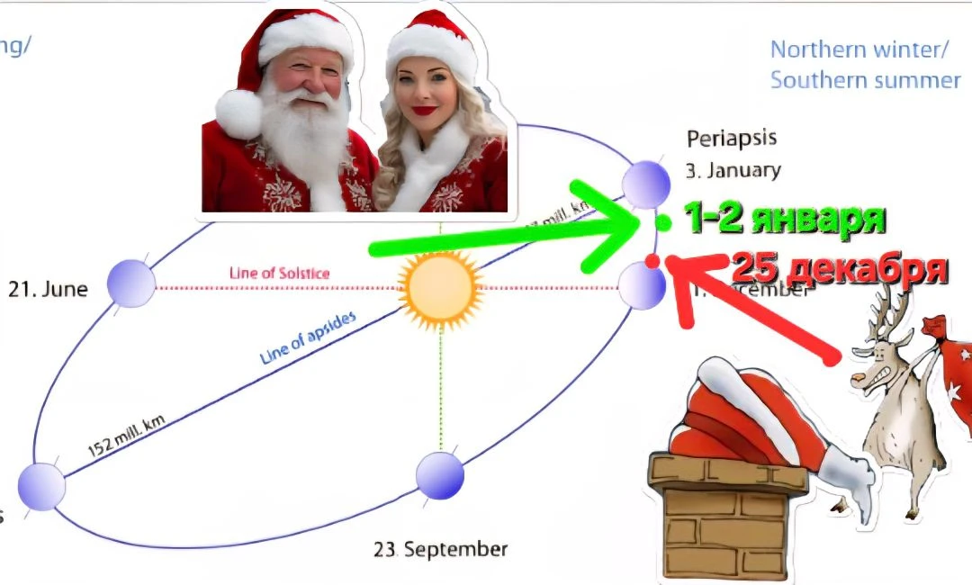 Причём точная дата перигелия смещается на один день примерно за 58 лет. Но Дед Мороз, обладая знанием орбитальной механики, всегда точно знает, когда он наступит в текущем году, и синхронизирует с ним свой визит. Санта же, судя по всему, пользуется устаревшими астрономическими таблицами, раз застрял на солнцестоянии.