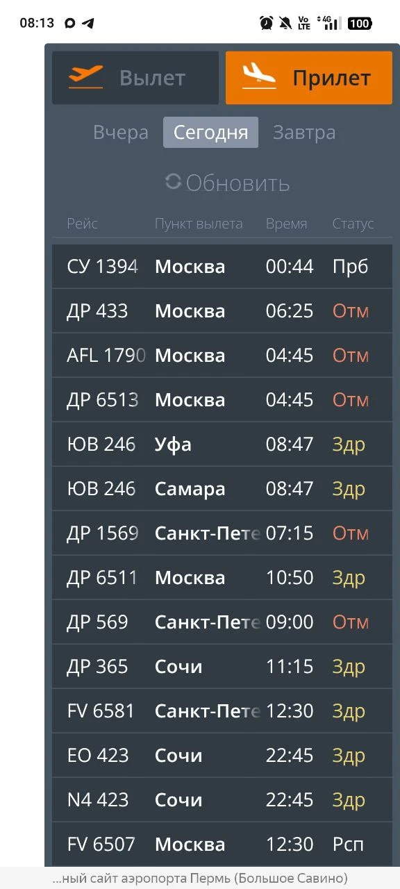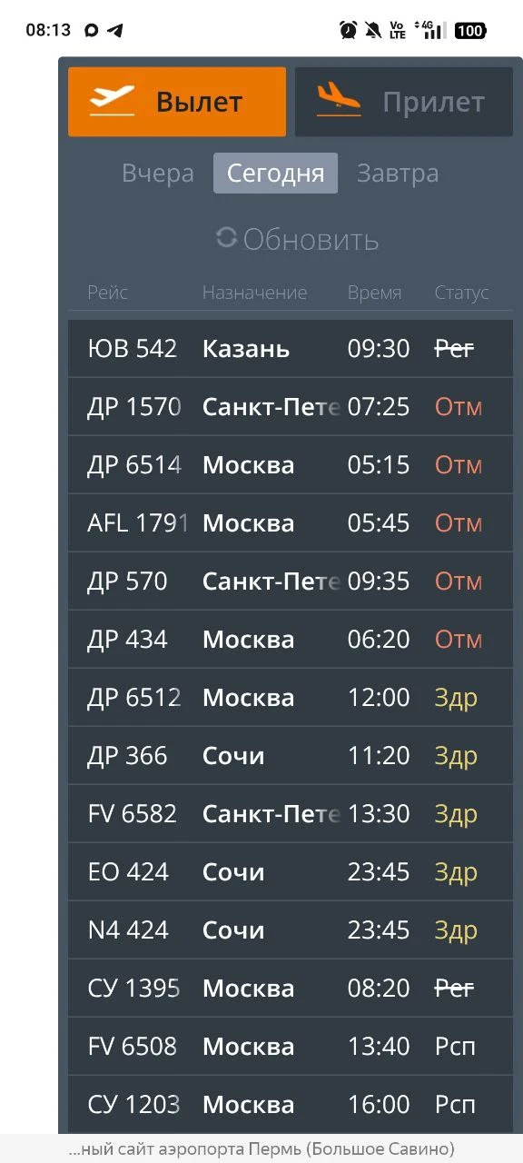 FV 6130 Пермь-Сочи задерживается на 11 часов: самолет авиакомпании “Россия” вылетит из Большого Савино в 15:55 вместо 06:50, указано на онлайн-табло.