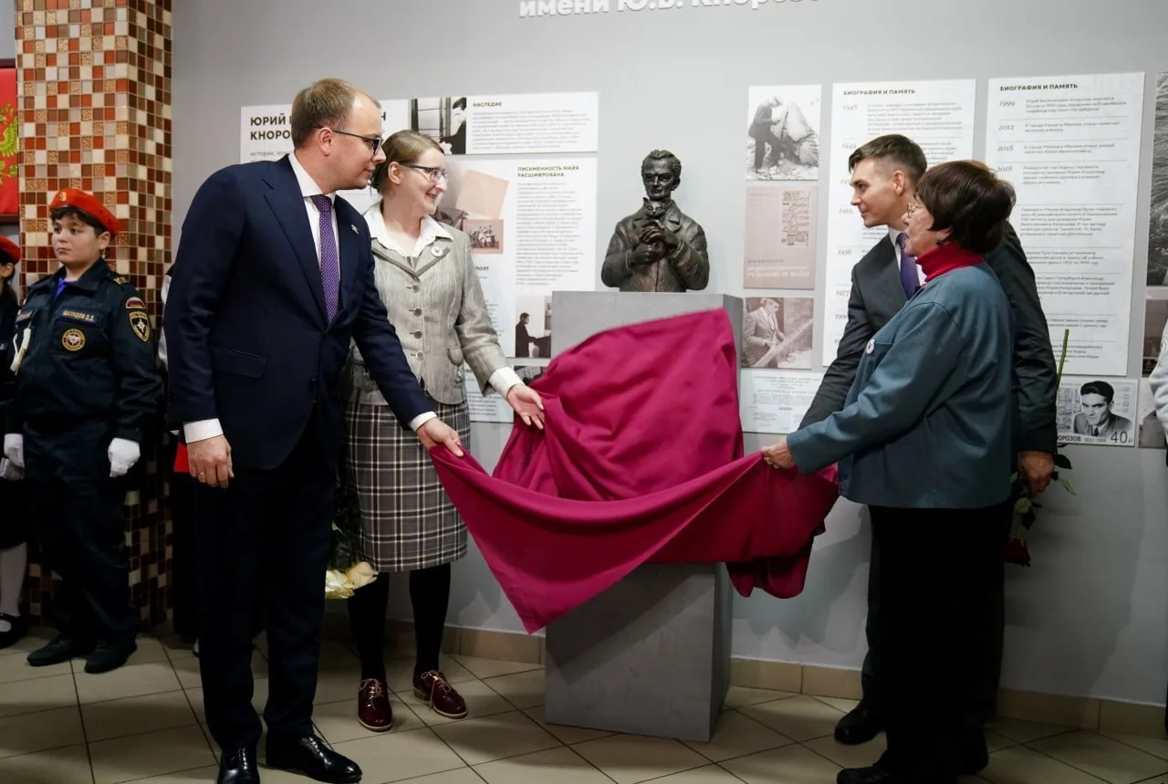 Первый памятник Юрию Кнорозову в России открыли в петербургской школе. В объёме воплотили одну из самых известных фотографий учёного с любимой кошкой Аспид на руках. На открытии школьникам рассказали, что погладить лапку Аси — это «на удачу».