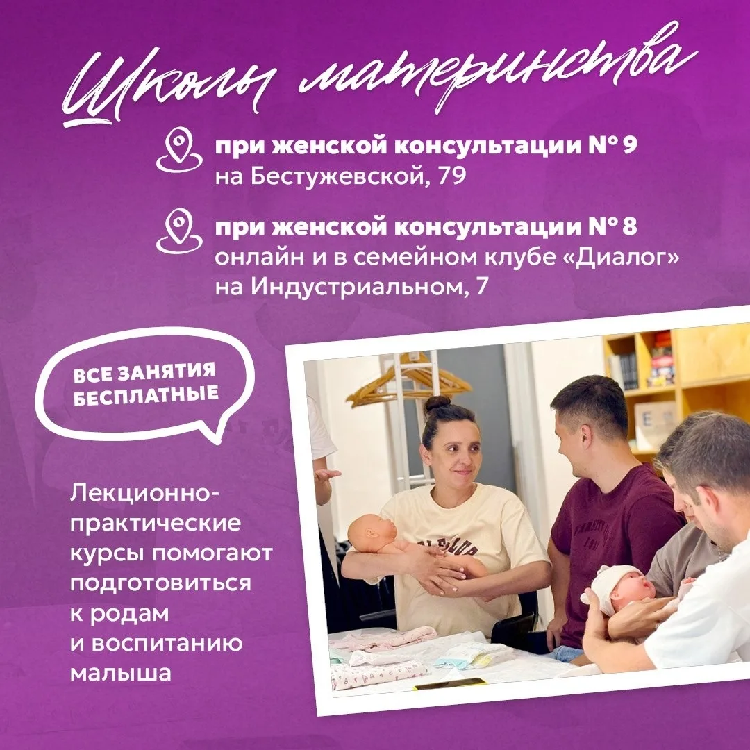 Лекционно-практические курсы проходят на базе женских консультаций №8 и №9. На занятиях специалисты рассказывают будущим родителям о протекании беременности и родов, обучают техникам дыхания и правилам ухода за новорождённым.