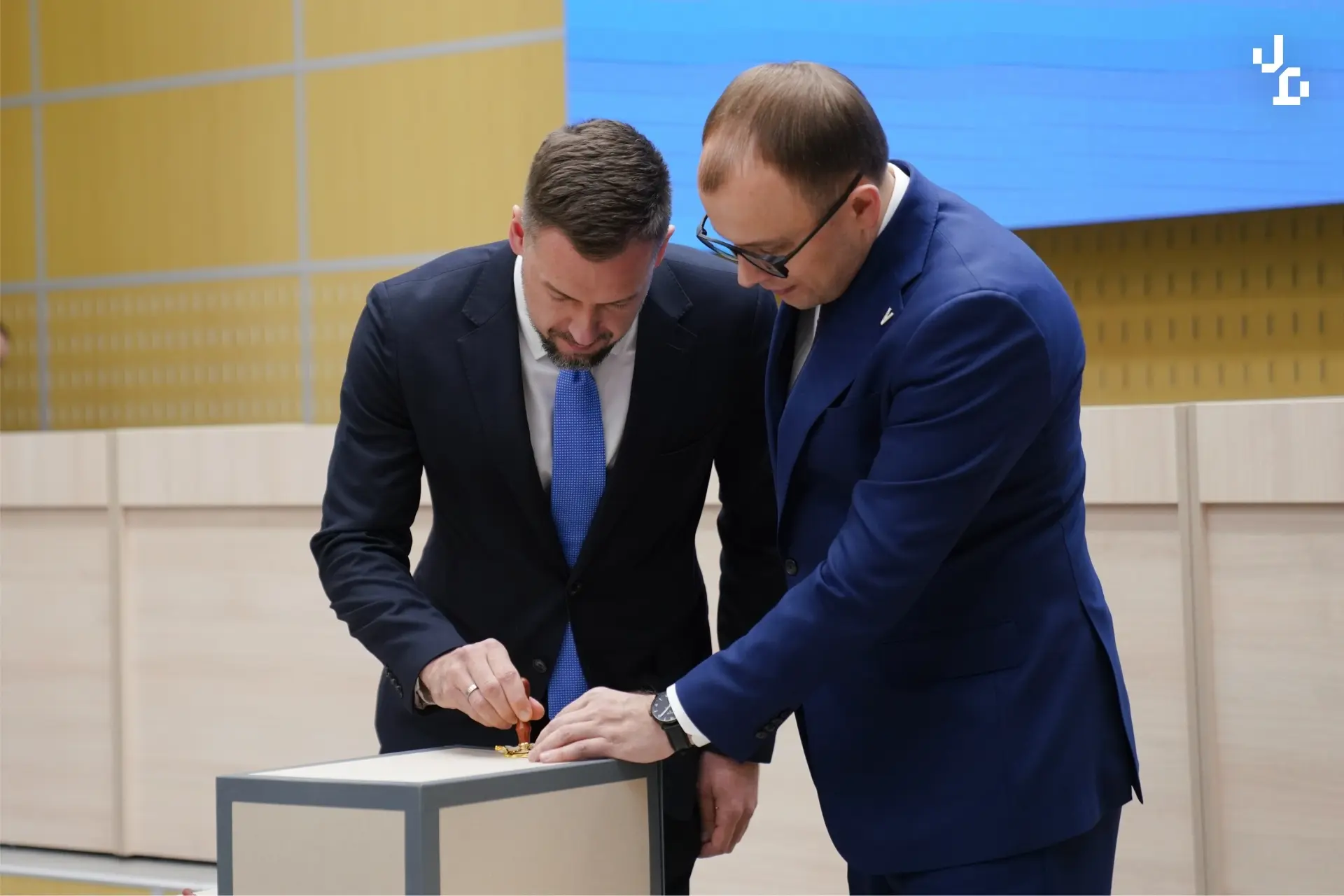 На ежегодном отчёте главы администрации вице-губернатор Санкт-Петербурга Алексей Корабельников и глава района Андрей Хорт наполнили капсулу предметами, которые олицетворяют дух эпохи.