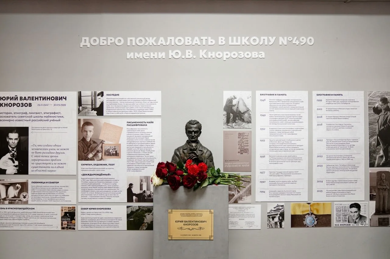 По инициативе внучки учёного Анны Масловой и его ученицы Маргариты Альбедиль в школе создан научно-исследовательский центр имени Ю. В. Кнорозова. Благодаря ему у детей появится возможность более детально познакомиться с работами учёного, участвовать в олимпиадах и фестивалях, писать исследовательские работы под руководством наставников из Музея антропологии и этнографии.