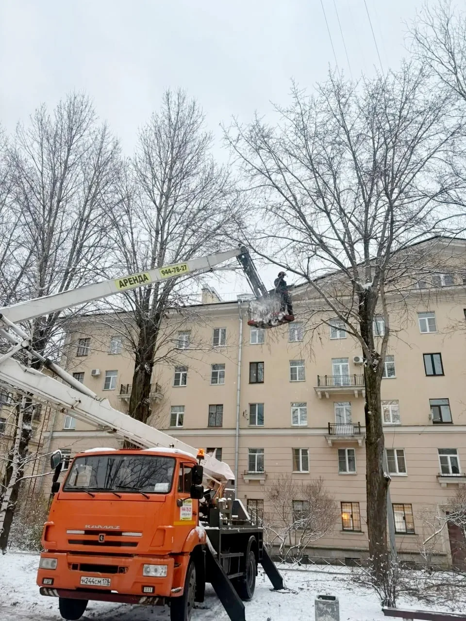 Устраняют старые и сухие ветви с старовозрастных деревьев специалисты садово-паркового предприятия «Охтинка». Своевременная обрезка обеспечивает безопасность горожан и их имущества.