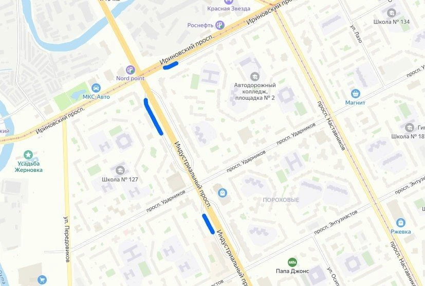 • по боковому проезду Индустриального проспекта у домов 38к1 и 28