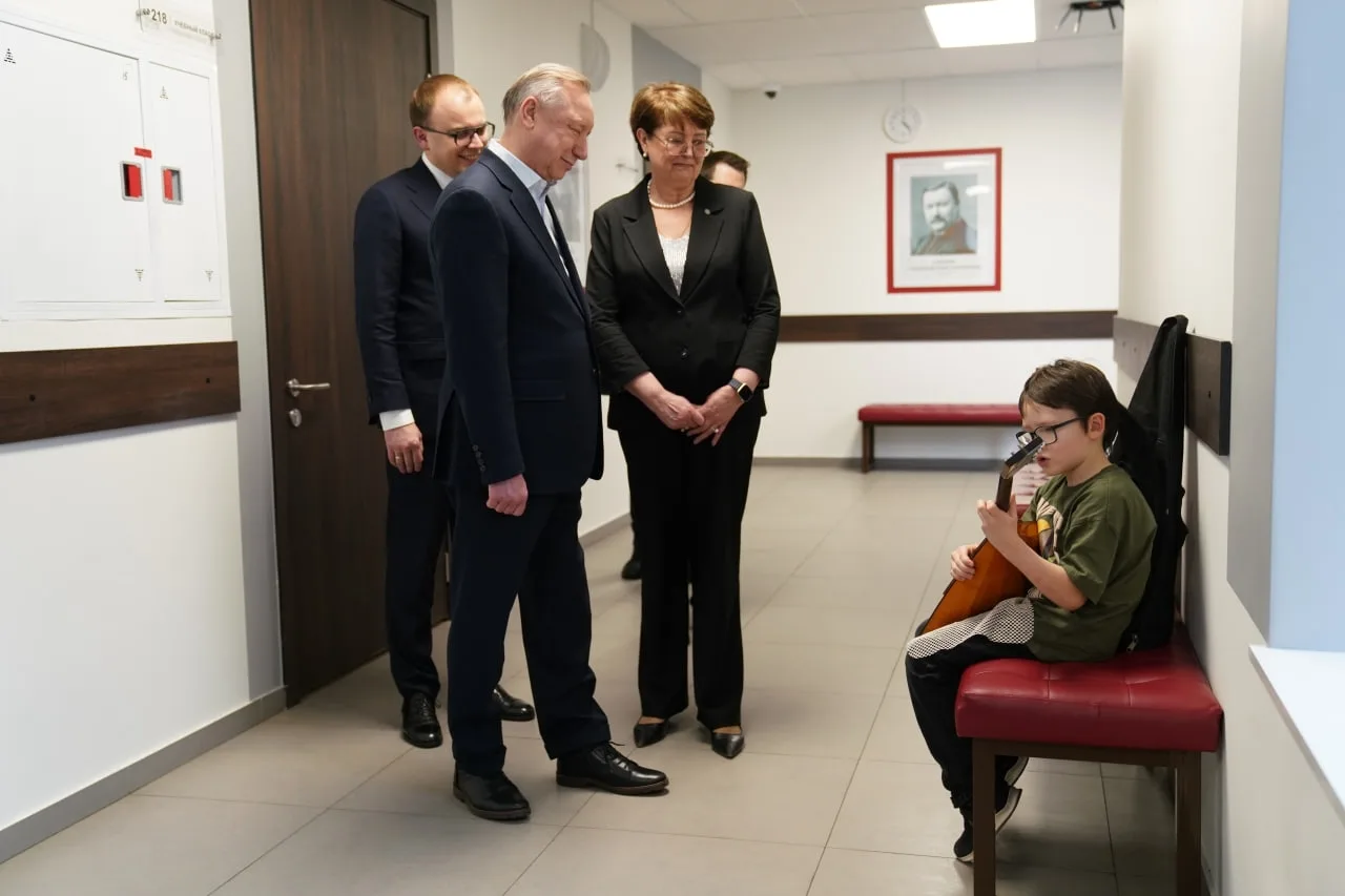 Охтинский центр эстетического воспитания в 2025 году отметил 50-летие. К юбилею главный корпус детской школы искусств был полностью обновлен, закуплены новые инструменты. Продемонстрировали Александру Дмитриевичу, как звучит акустика зала, оборудованного на уровне лучших концертных и театральных площадок исполнением легендарной композиции «Город над вольной Невой».