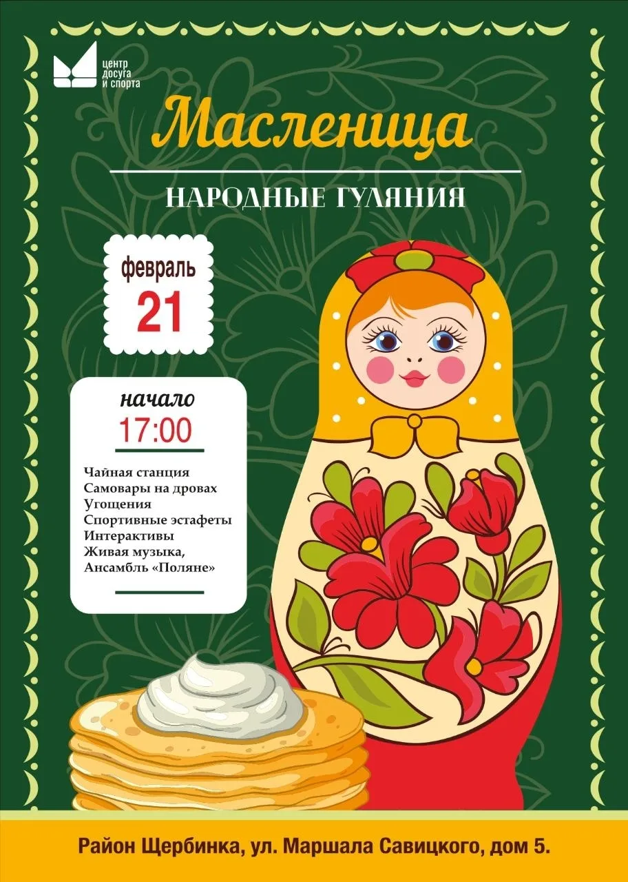 💫22 февраля начало мероприятий запланировано на 12:00. Дом культуры «Пересвет» представит концертную программу «Широкая Масленица» с выступлениями творческих коллективов и народными забавами. Дворец культуры «Щербинка» проведет уличные гуляния. Дом культуры «Десна» организует «Масленичный разгуляй» в парковой зоне у дома 6 поселка Фабрики имени 1 Мая. На ледовой площадке вблизи улицы Маршала Савицкого пройдут народные гуляния с мастер-классами и эстафетами.