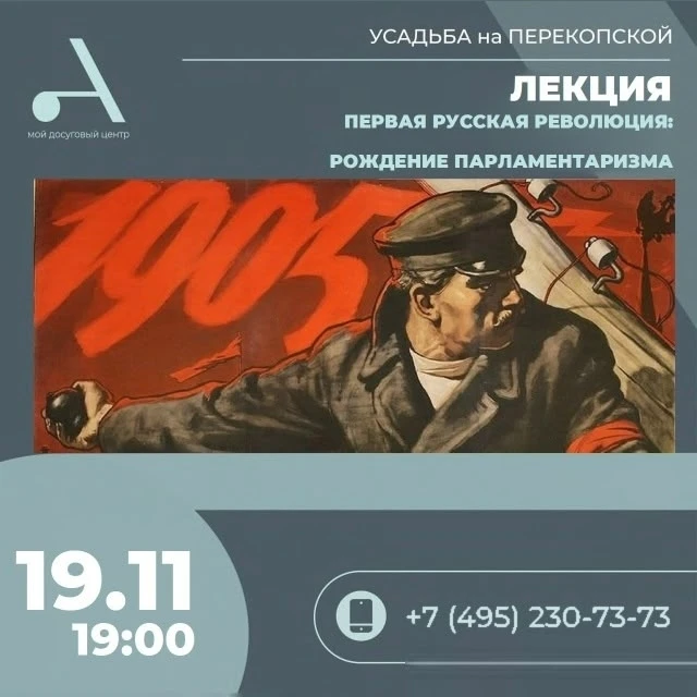 19 ноября в 19:00 состоится лекция «Первая русская революция: рождение парламентаризма» (16+). Узнайте о ключевых событиях начала XX века и становлении парламентаризма в России.