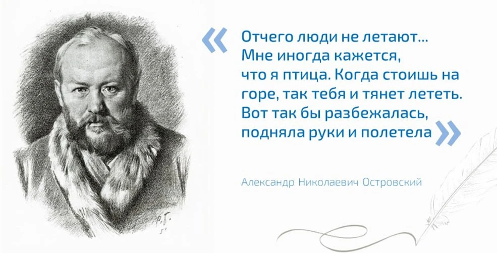 "Отчего люди не летают... Мне иногда кажется, что я птица. Когда стоишь на горе, так тебя и тянет лететь. Вот так бы разбежалась, подняла руки и полетела" (Александр Островский)