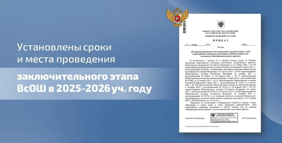С приказом Минпросвещения России от 19.11.2025 № 823 «Об определении сроков и мест проведения заключительного этапа всероссийской олимпиады школьников в 2025/26 учебном году по каждому общеобразовательному предмету», можно ознакомиться, перейдя по ссылке 🖥