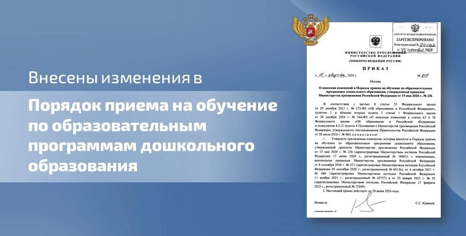 С приказом Министерства просвещения Российской Федерации от 18.08.2025 № 609 «О внесении изменений в Порядок приема на обучение по образовательным программам дошкольного образования, утвержденный приказом Министерства просвещения Российской Федерации от 15 мая 2020 г. № 236» можно ознакомиться здесь 🖥