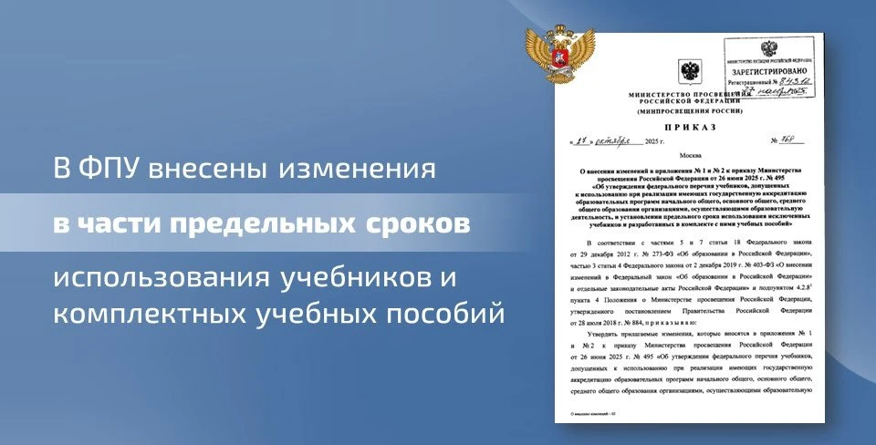 С приказом Минпросвещения России от 27.10.2025 № 768 «О внесении изменений в приложения № 1 и № 2 к приказу Министерства просвещения Российской Федерации от 26 июня 2025 г. №" 495 «Об утверждении федерального перечня учебников, допущенных к использованию при реализации имеющих государственную аккредитацию образовательных программ начального общего, основного общего, среднего общего образования организациями, осуществляющими образовательную деятельность, и установлении предельного срока использования исключенных учебников и разработанных в комплекте с ними учебных пособий» можно ознакомиться здесь 🔍