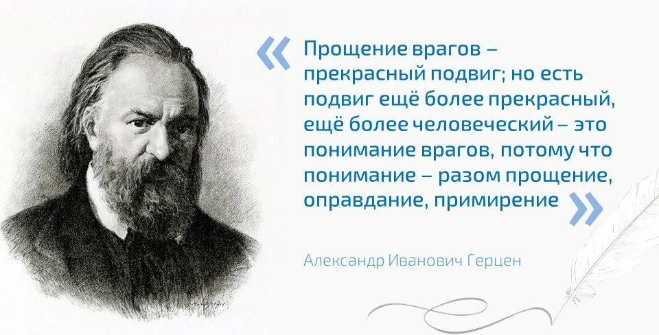 "Прощение врагов – прекрасный подвиг; но есть подвиг ещё более прекрасный, ещё более человеческий – это понимание врагов, потому что понимание – разом прощение, оправдание, примирение" (Александр Герцен)