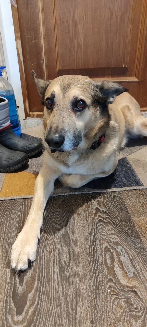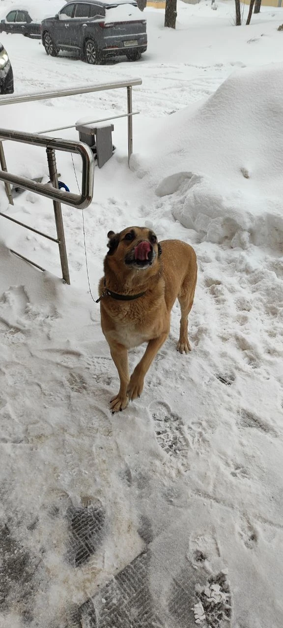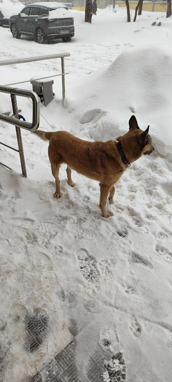 Найдена собака в старых ватутинках у пятерочки. Явно потеряшка. Кобель, кастрированый. Бегал вместе с рулеткой на ошейнике. Помогите найти хозяина!