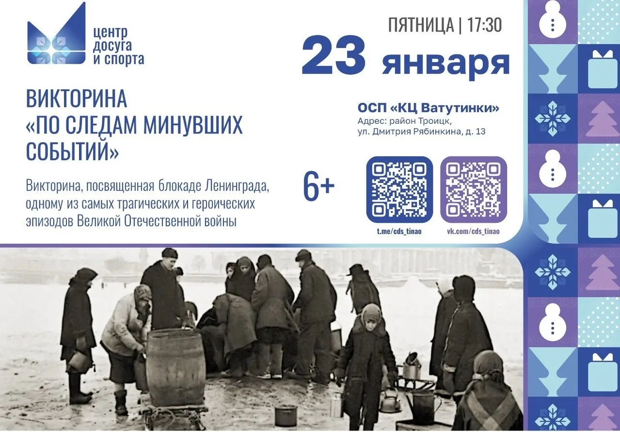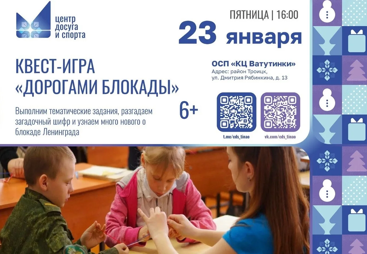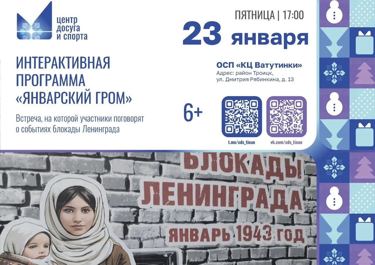 23 января в Культурном центре «Ватутинки» пройдёт серия мероприятий, посвящённых блокаде Ленинграда — одному из самых трагических и героических эпизодов Великой Отечественной войны. Программа рассчитана на детей от 6 лет и включает три увлекательных блока: