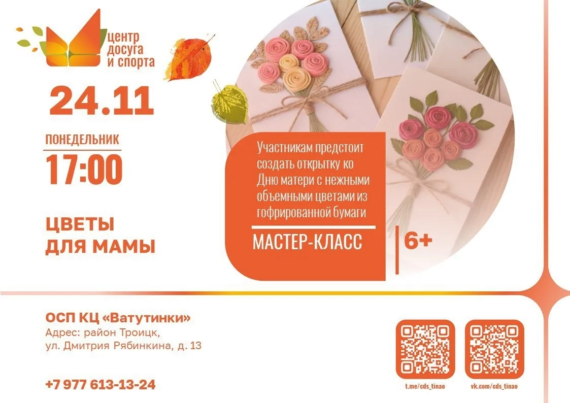 Дорогие друзья! Приглашаем детей от 6 лет на творческий мастер‑класс, где каждый сможет сделать неповторимую открытку ко Дню матери 24 ноября в 17:00.