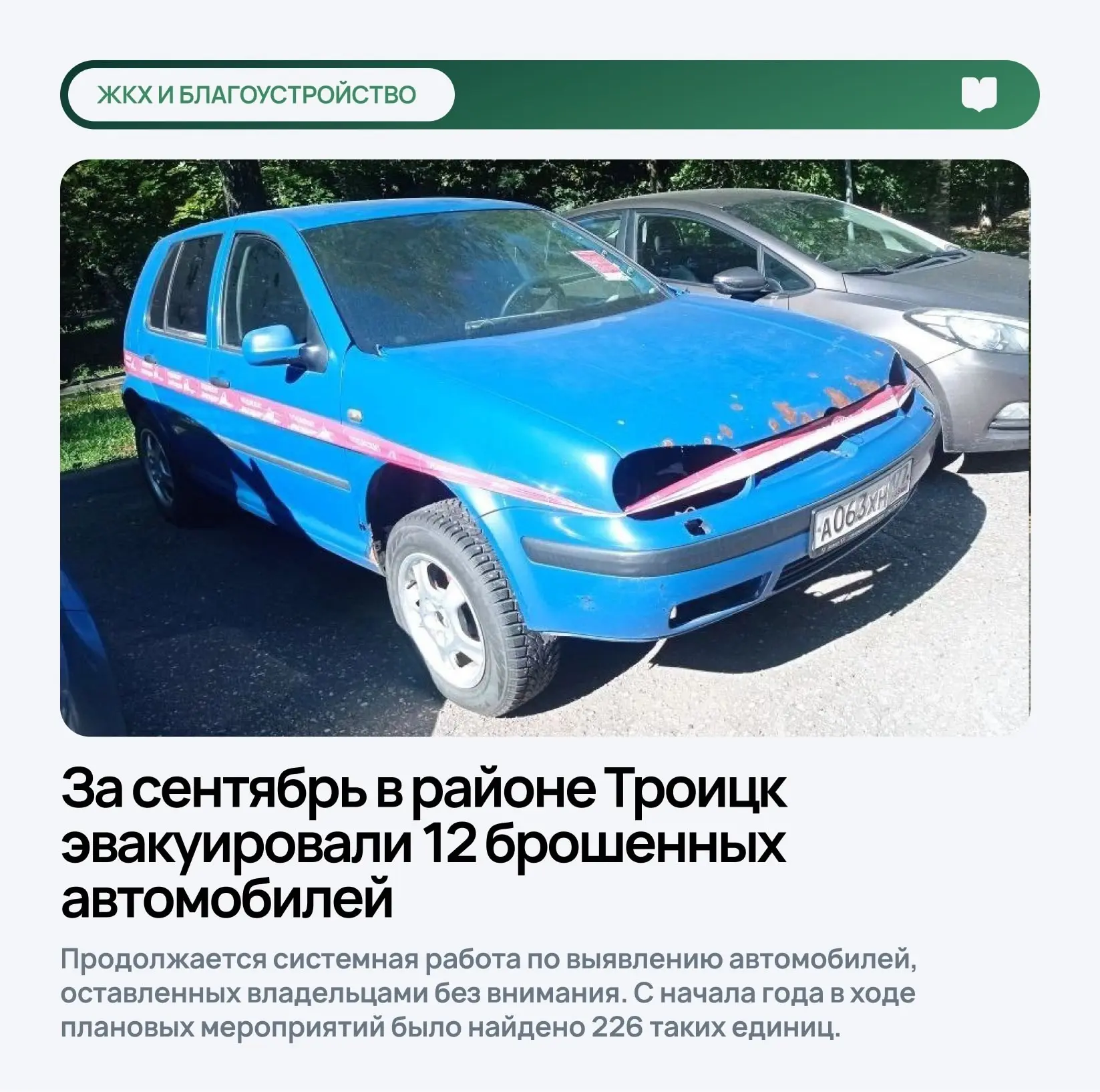 В сентябре специалисты управы района Троицк обследовали территорию, осмотрев 28 единиц транспорта. По результатам проверки 12 машин были официально признаны брошенными. Основанием для такого статуса послужили характерные признаки: сильные загрязнения кузова, спущенные шины, отсутствие государственных номеров и повреждения.
