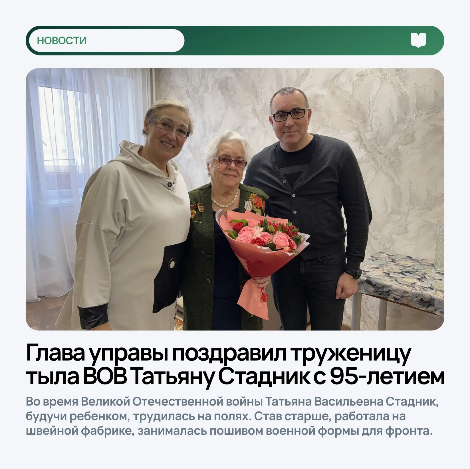 Глава управы поздравил труженицу тыла ВОВ Татьяну Стадник с 95-летием