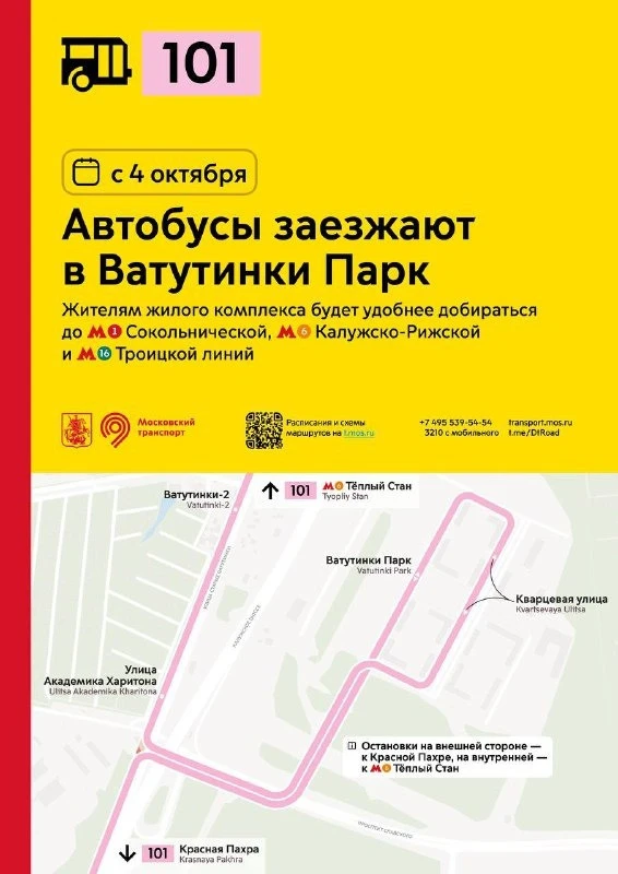 🚌 С 4 октября автобусы 101 будут заезжать в Ватутинки Парк.