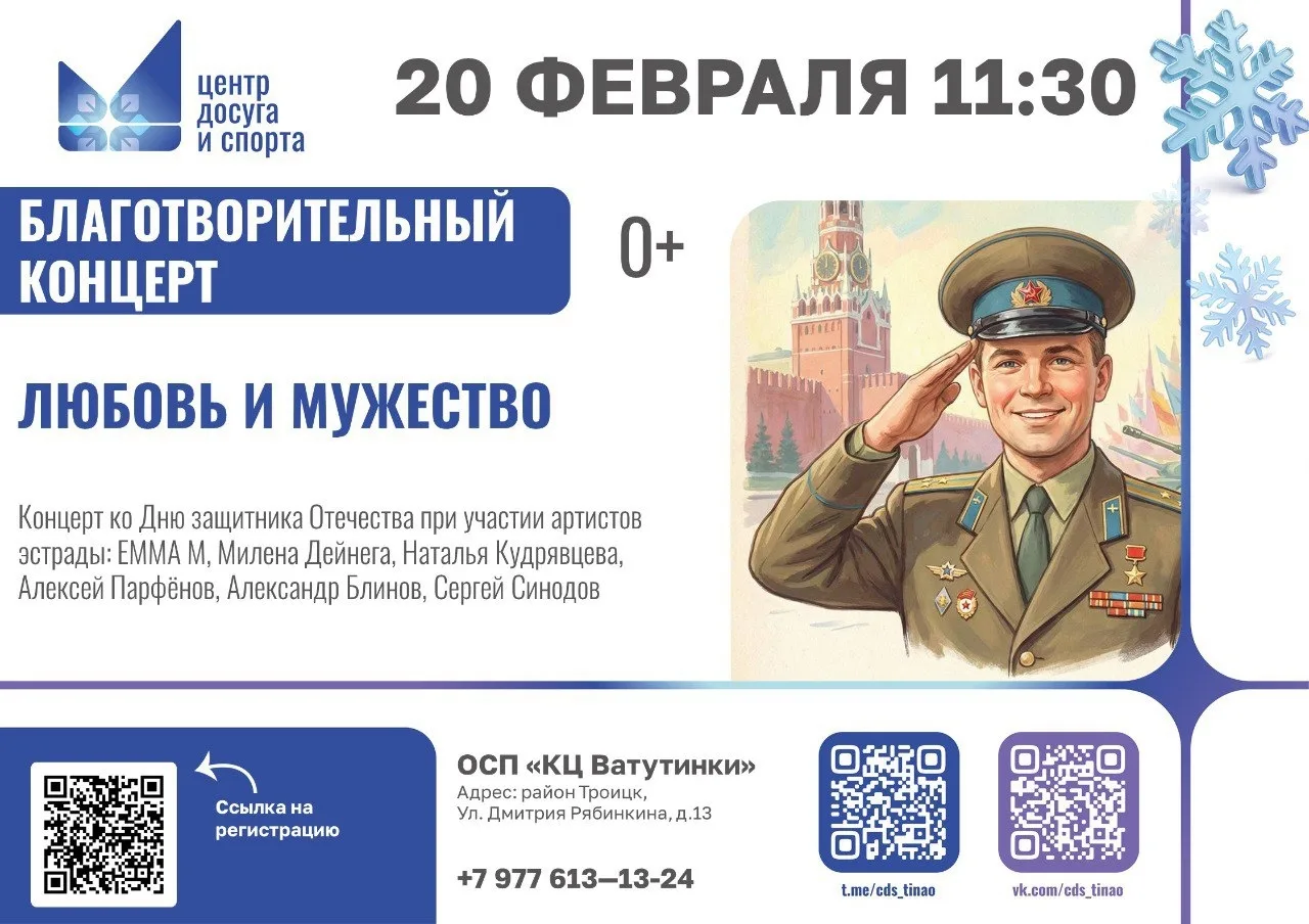 🎖️20 февраля в 11:30 в Культурном центре «Ватутинки» состоится торжественный концерт, посвящённый Дню защитника Отечества — празднику мужества и отваги!