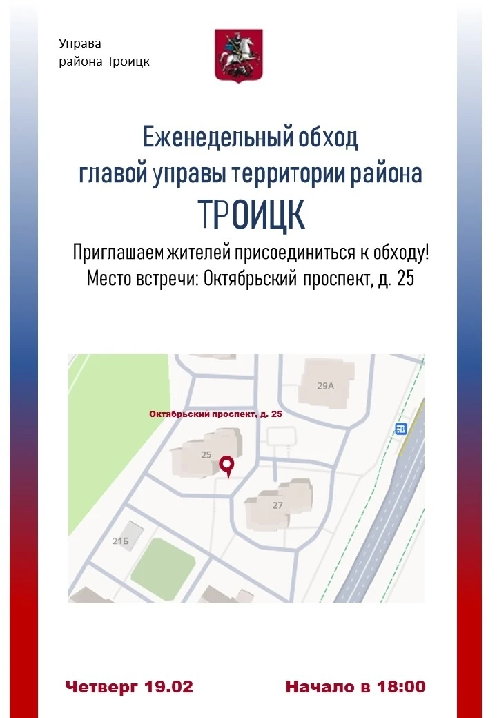 Глава управы вместе с жителями, представителями ГБУ «Жилищник района Троицк», специалистами эксплуатирующих организаций, муниципальными депутатами и общественными советниками проведет обход территории в четверг 19 февраля на Октябрьском проспекте.