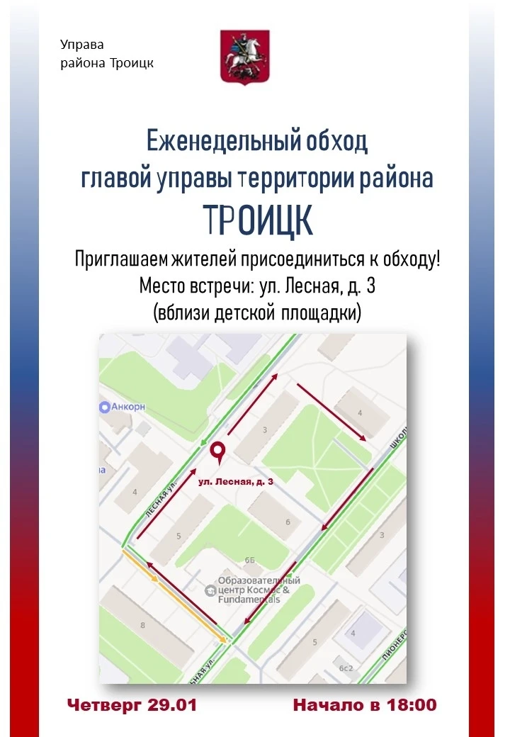 Глава управы вместе с жителями, представителями ГБУ «Жилищник района Троицк», специалистами эксплуатирующих организаций, муниципальными депутатами и общественными советниками проведет обход территории в четверг 29 января во дворах домов 3, 5, 6 и 6Б на Лесной улице.