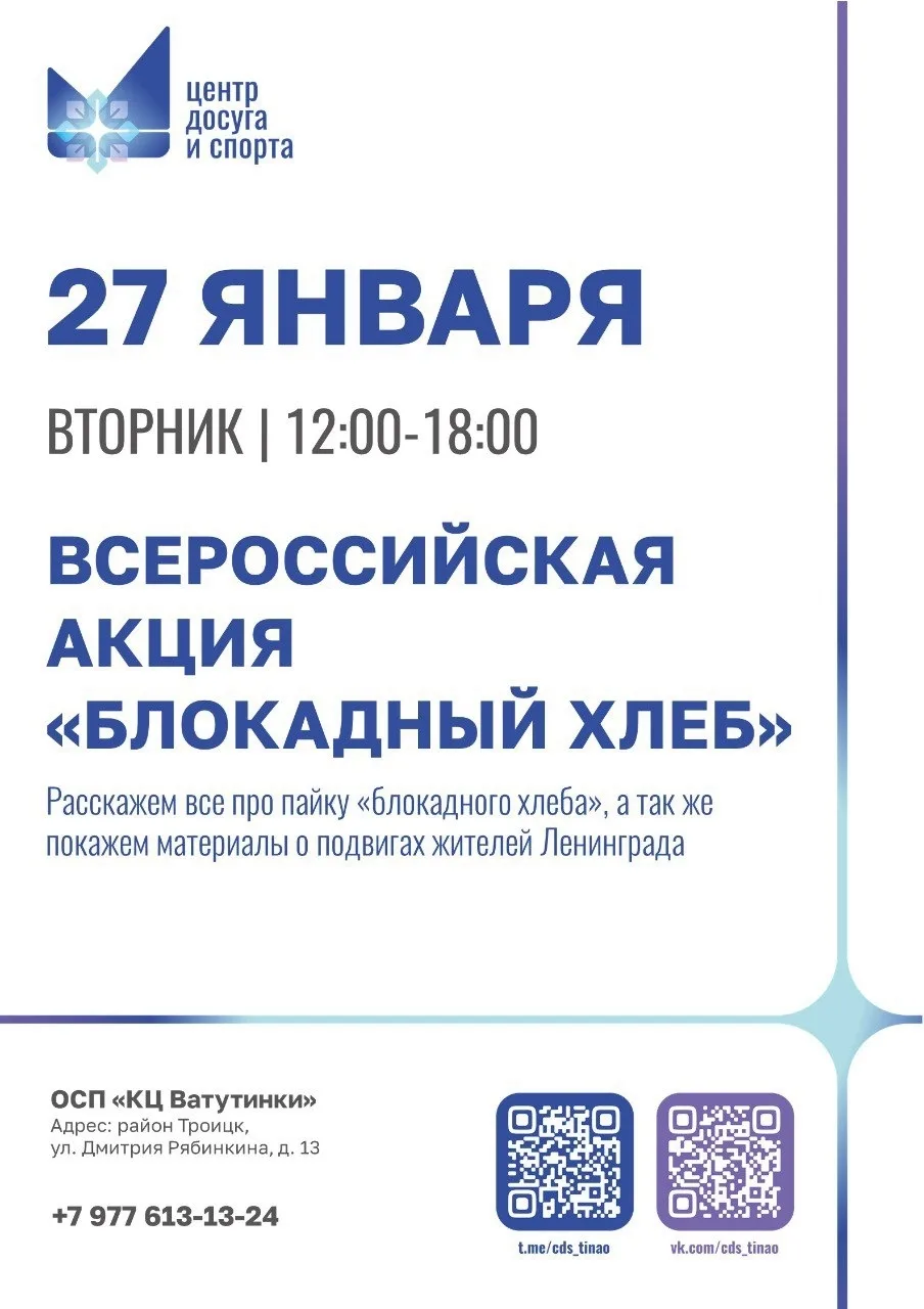 Завтра, 27 января с 12:00 до 18:00, в день полного освобождения Ленинграда от фашистской блокады, пройдёт Всероссийская акция «Блокадный хлеб» в КЦ «Ватутинки».