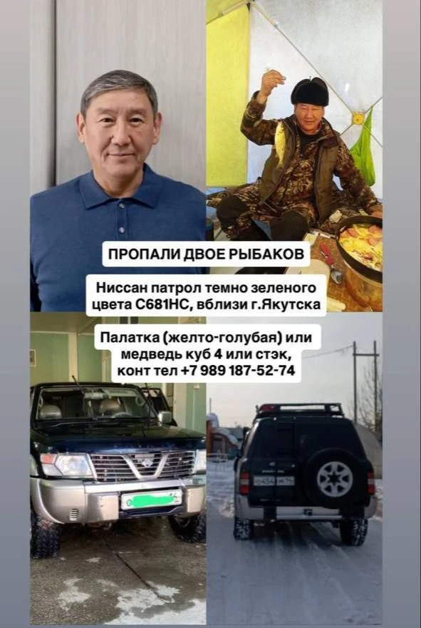 6 декабря двое мужчин выехали с Якутска на рыбалку на протоку на автомобиле и до сих пор не вернулись. На связь выходили с Кангаласцев и с. Едяй Намского района. О пропаже сообщила супруга одного из пропавших.