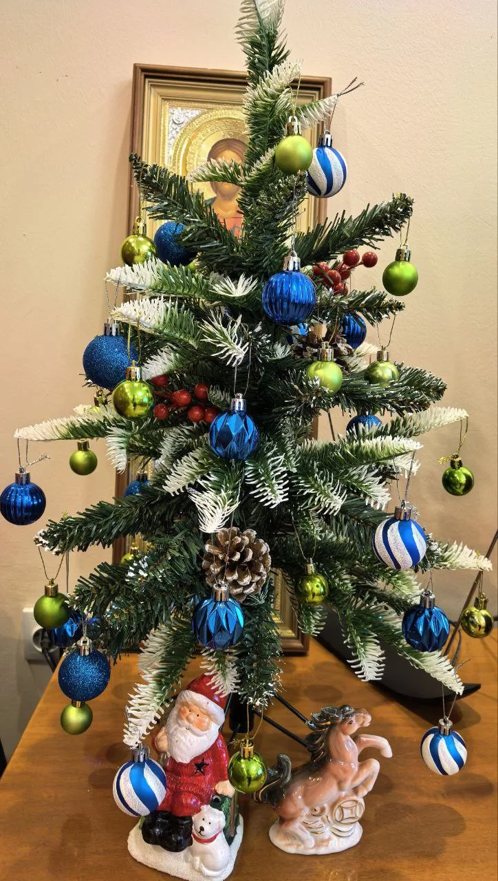 Его скромная елочка в сине-зеленых тонах. Синий символизирует гармонию, мудрость и спокойствие, а зеленый — рост и обновление. Сувенир дань наступающему году Лошади, который будет явно благодушен Сахамину Милановичу.