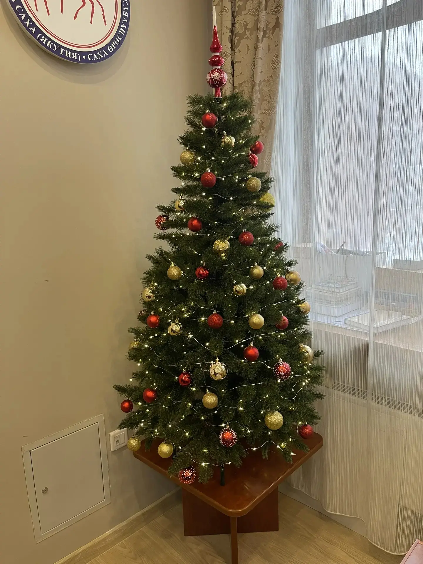 Первым делом заглянули в кабинет к Димдимычу в ДП-1. Первый зампред Якутии как обычно весь в трудах и хлопотах, деловушка. Невысокая, элегантная елка притулилась в углу у окна, выдержана в классических красно-золотых тонах.