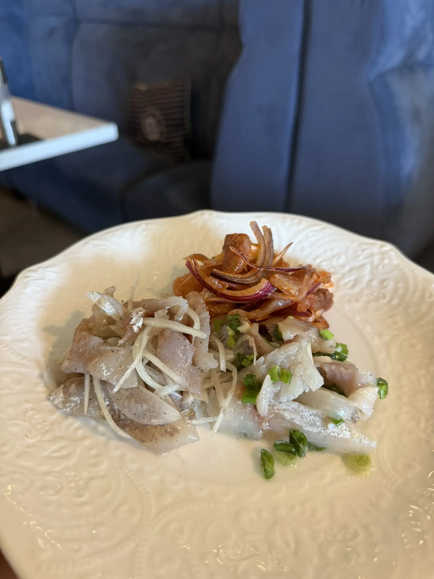 ▪️ Сначала принесли комплимент от шефа — мармелад из просекко на подложке из клубники со взрывной карамелью и шипучими гранулами.