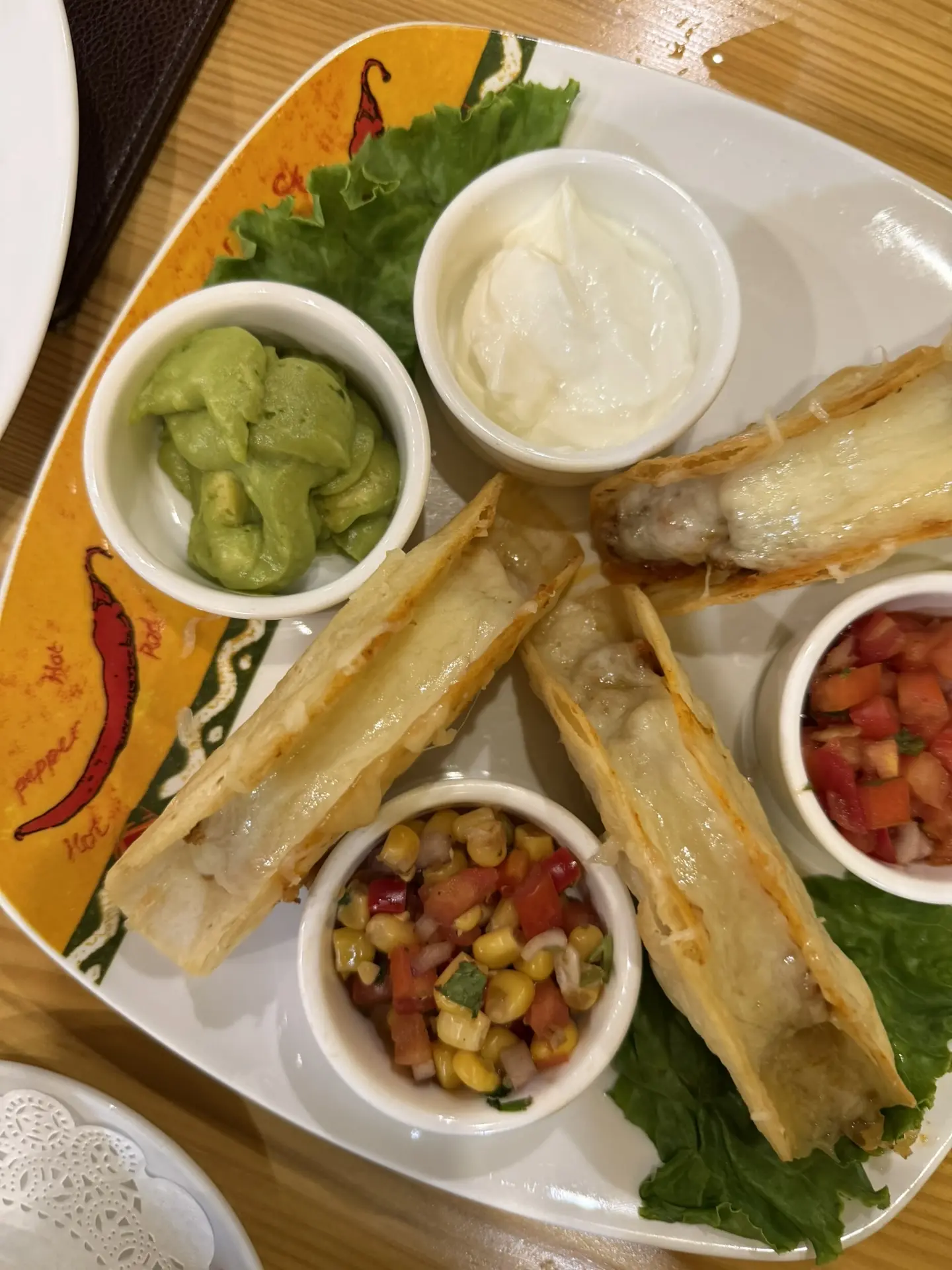 Тортильи обжариваются во фритюре, фаршируются патахи (фасоль) и начинками: курица, говядина, свинина. Запекаются с сыром. Подаются с соусами «Пико де Гайо»(это что-то на помидорном), «Сальса кукурузная», «Гуакамоле» и сметаной.
