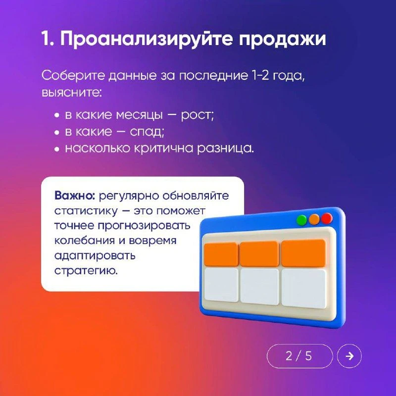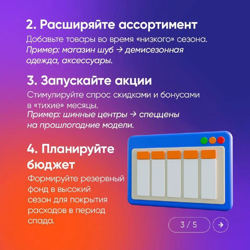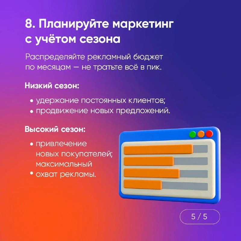 Сезонные спады — боль многих предпринимателей. Но получать стабильную выручку круглый год — реальность, если всё продумать заранее. Собрали в карточках 8 работающих советов, которые помогут сгладить сезонные колебания.