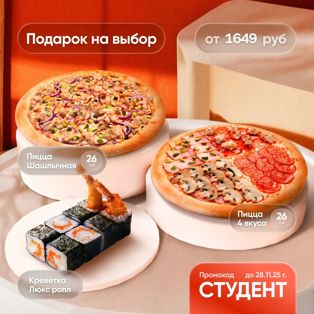 По промокоду СТУДЕНТ выбирайте блюдо в подарок к заказу от 1649 рублей: пицца Шашлычная 26 см или пицца 4 вкуса 26 см или Креветка Люкс ролл.