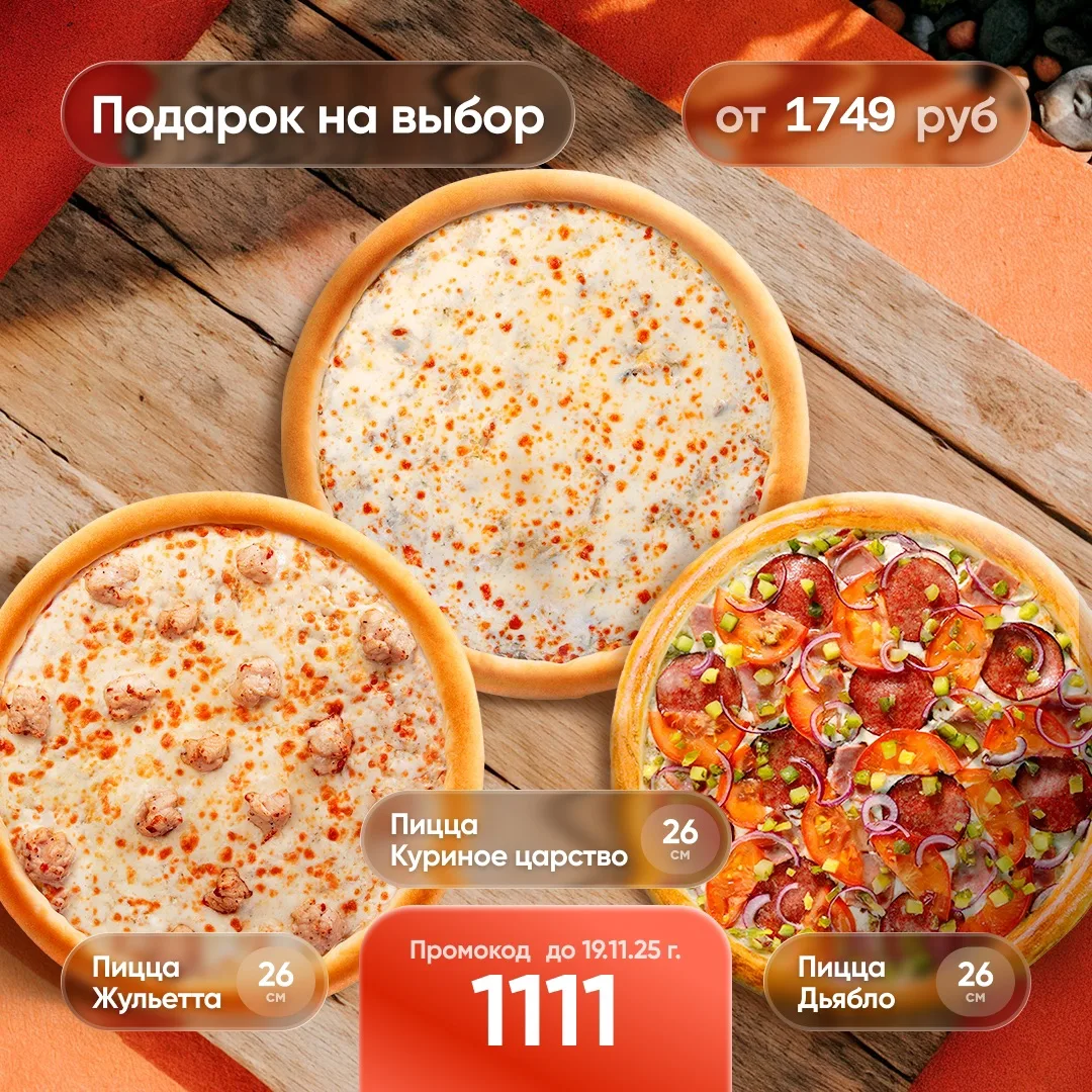 Черная пятница в PizzaSushiWok со вкусом! Вводите промокод 1111, при заказе от 1749 рублей и забирайте пиццу в подарок на выбор: Жульетта 26 см или Куриное Царство 26 см или Дьябло 26 см! Предложение действительно до 19 ноября включительно.